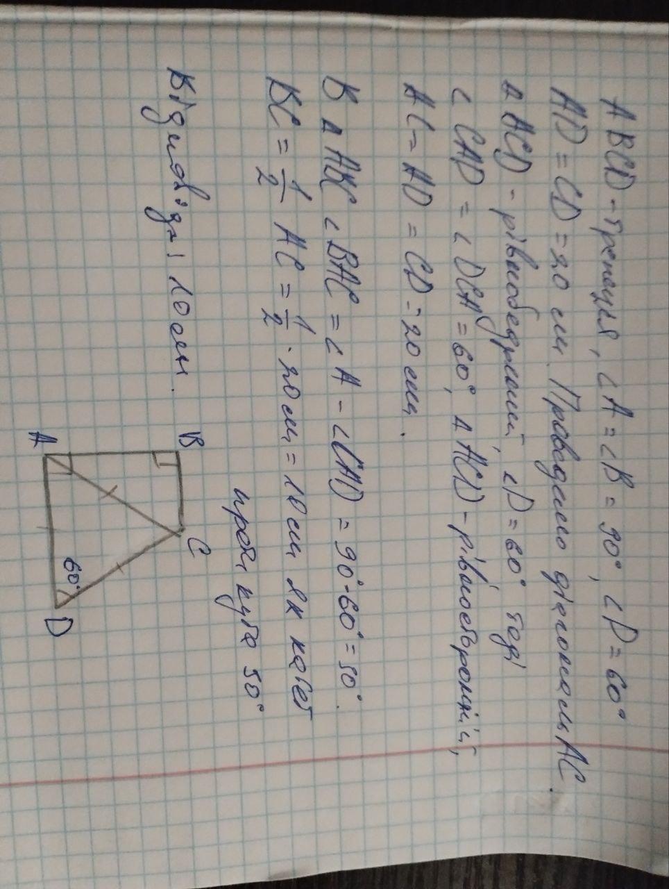 У прямокутній трапеції гострий кут дорівнює 60°. Більша бічна сторона і більша основа дорівнюють по 20 см. Знайдіть меншу основу.