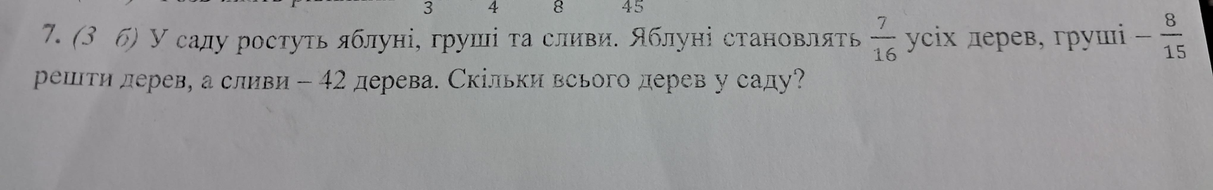 1)16/16-7/16=9/16 (частей приходиться на груши и сливы), 2)9/16*8/15=3/10 (частей при приходиться на груши), 3) 7/16+3/10= 118/160 (частей приходится на яблони и груши), 4)160/160 -118/160=42/160 (42/160 частей приходится на сливы) Составляем пропорцию: 42: 42=х:160 х=42*160/42 х=160 деревьев. Ответ: 160 деревьев в саду. Проверка: 7/16*160 =70 яблонь, 3/10*160=48 груш, 70+48+42=160 деревьев всего в саду.