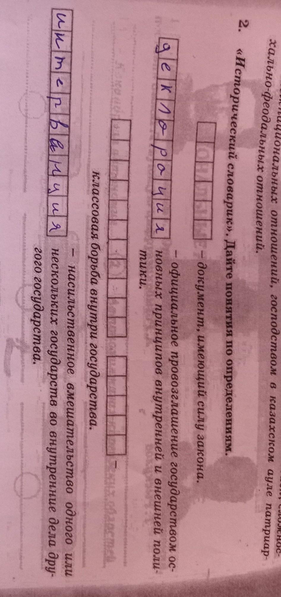 «Исторический словарик». Дайте понятия по определениям. - документ, имеющий силу закона. декларация официальное провозглашение государством ос- новных принципов внутренней и внешней поли- muku. классовая борьба внутри государства. тервенция - насильственное вмешательство одного или нескольких государств во внутренние дела дру- гого государства. С