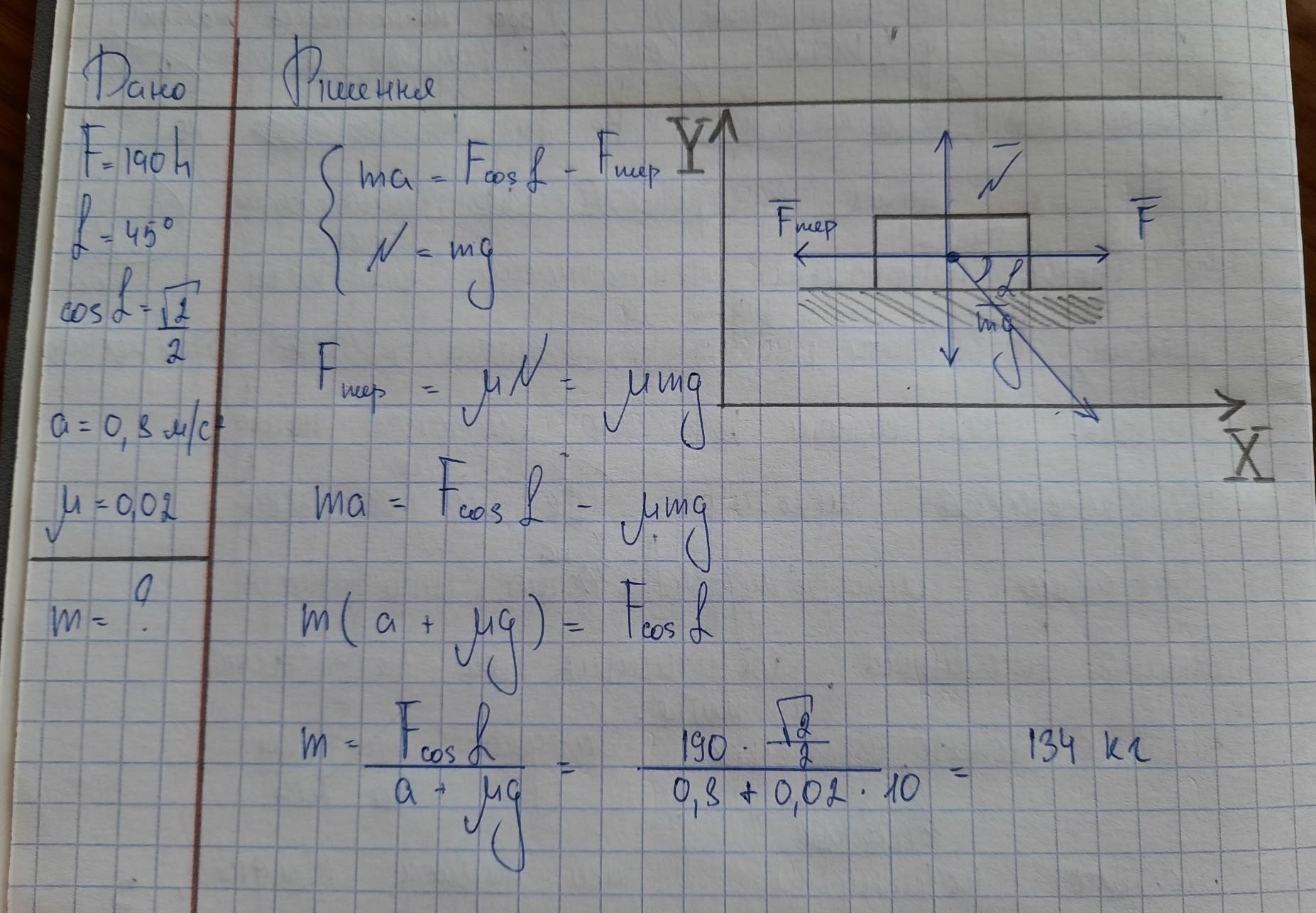 Робітник штовхає по горизонтальній дорозі вагонетку з силою 190Н, яка напрямлена вниз під кутом 450 до горизонту. Визначте масу вагонетки, якщо відомо, що прискорення, з яким рухається вагонетка, дорівнює 0,8 м/с2 , а коефіцієнт тертя 0,02?