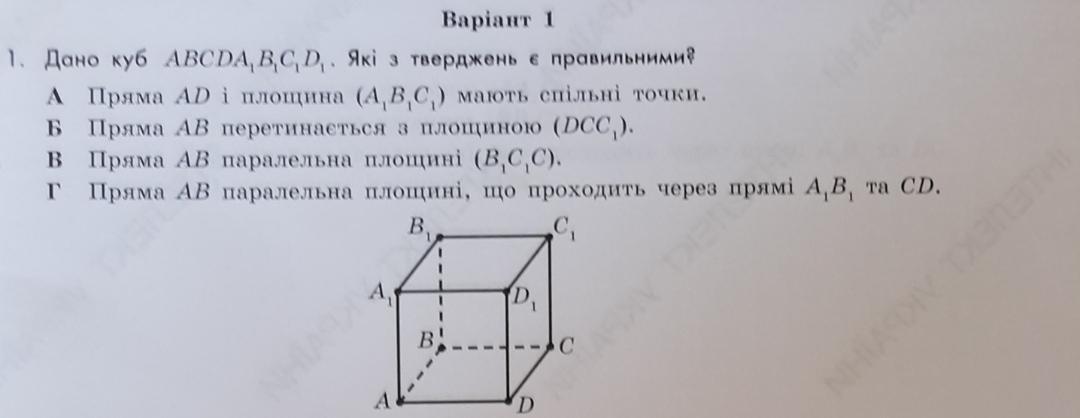 Дано куб ABCDA,B,C,D,. Які з тверджень є правильними А Пряма AD і площина (А,В,С.) мають спільні точки. Б Пряма АВ перетинається з площиною (DCC). В Пряма АВ паралельна площині (В.С.С). Г Пряма АВ паралельна площині, що проходить через прямі А,В, та CD.