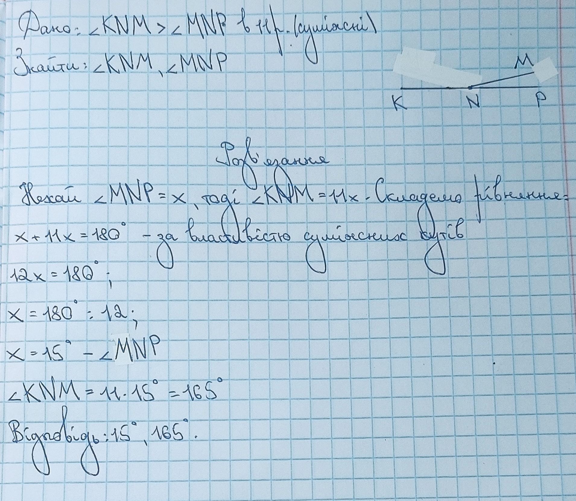 6. Кути KNM то MNP суміжні. Кут KNM в 11 разів більший вiд кута MNP. Знайди градусну міру цих кутів. (2 бали) МАЛЮНОК!!!