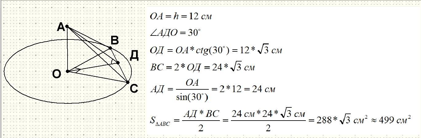 Через дві твірні конуса проведено площину, яка перетинає його основу по хорді, що стягує дугу, градусна міра якої дорівнює 90°. Кут між проведеною площиною та площиною основи дорівнює 30°. Висота конуса дорівнює 12 см. Знайдіть площу утвореного перерізу.