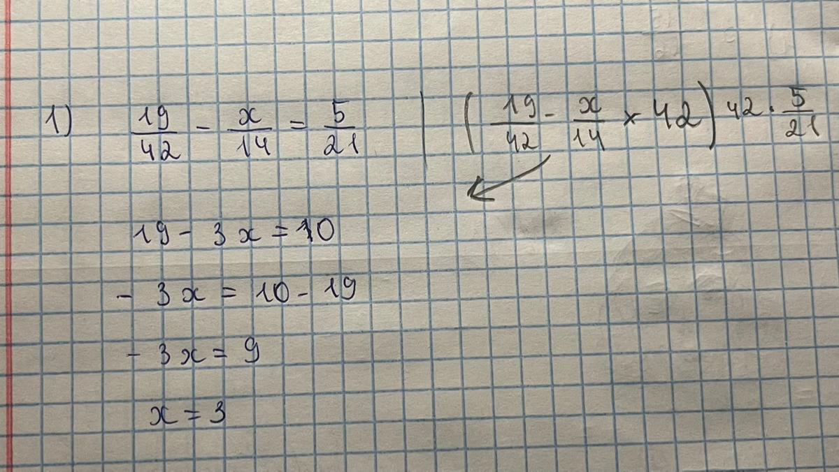 Розв'яжи рівняння. 1)19/42-x/14=5/21
