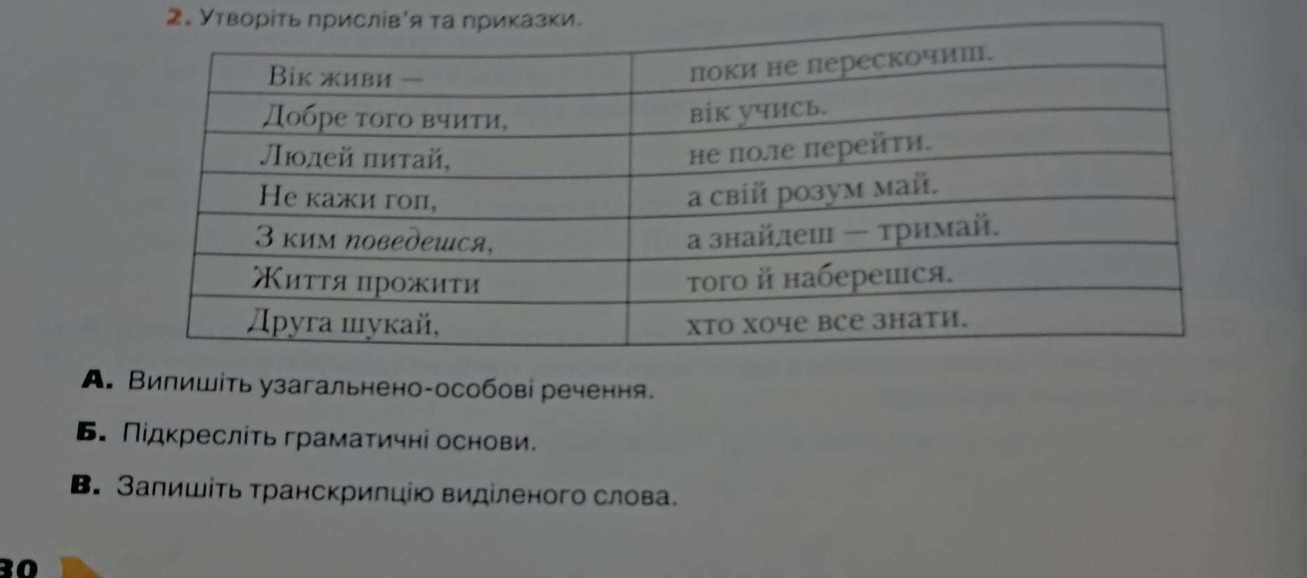 Не кажи гоn, З ким поведешся, Життя прожити Друга шукай, А. Випишіть узагальнено-особові речення. Б. Підкресліть граматичні основи. В. Запишіть транскрипцію виділеного слова. поки не перескочиш. вік учись. не поле перейти. а свій розум май. а знайдеш - тримай. ТОГО Й наберешся. хто хоче все знати.