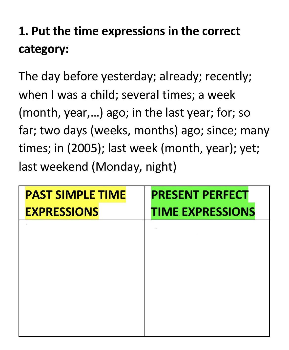 PAST SIMPLE TIME EXPRESSIONS:The day before yesterdayWhen I was a childA week (month, year) agoTwo days (weeks, months) agoLast week (month, year)Last weekend (Monday, night)