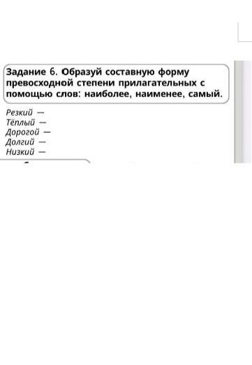 Задание 6. Образуй составную форму превосходной степени прилагательных с помощью слов: наиболее, наименее, самый. Резкий Тёплый Дорого Долги Низки