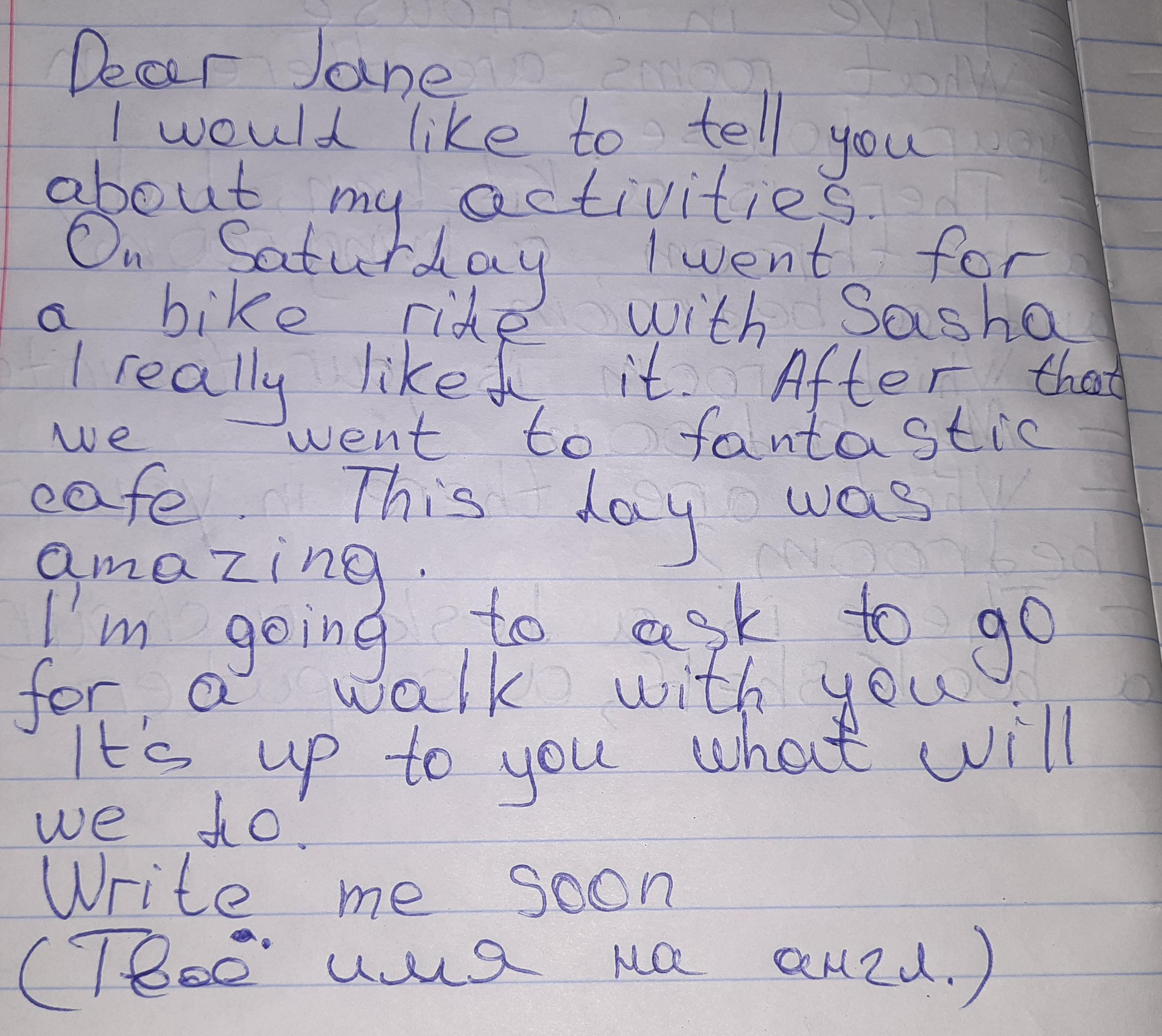 You and a friend recently did a social activity together (e.g. going for a bike ride, playing basketball, meeting for a coffee, etc.). Write an informal letter to another friend. Follow the instructions below. Say which activity you did and who with. • Give your personal opinion about the activity. Mention what you did after the activity. • Invite your friend to do a similar activity with you soon.