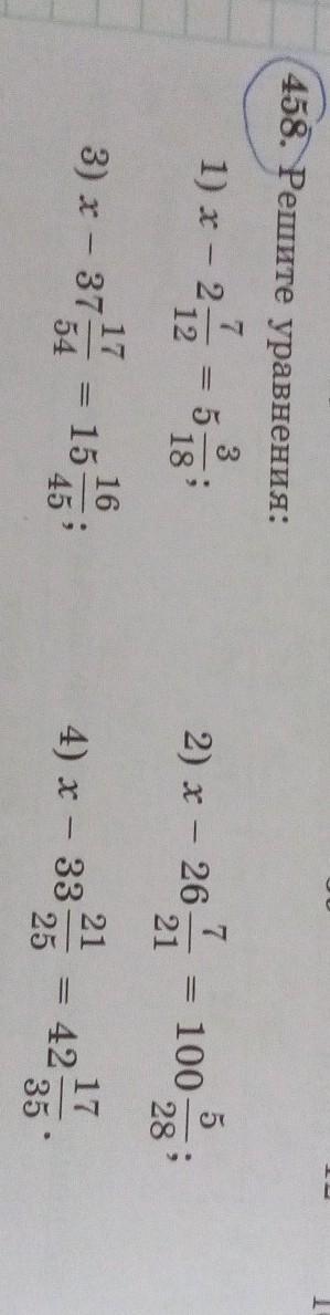 458. Решите уравнения: 1)x-2 7/12=5 3/18 2)x-26 7/21=100 5/28 3)x-37 17/54=15 16/45 4)x-33 21/25=42 17/35