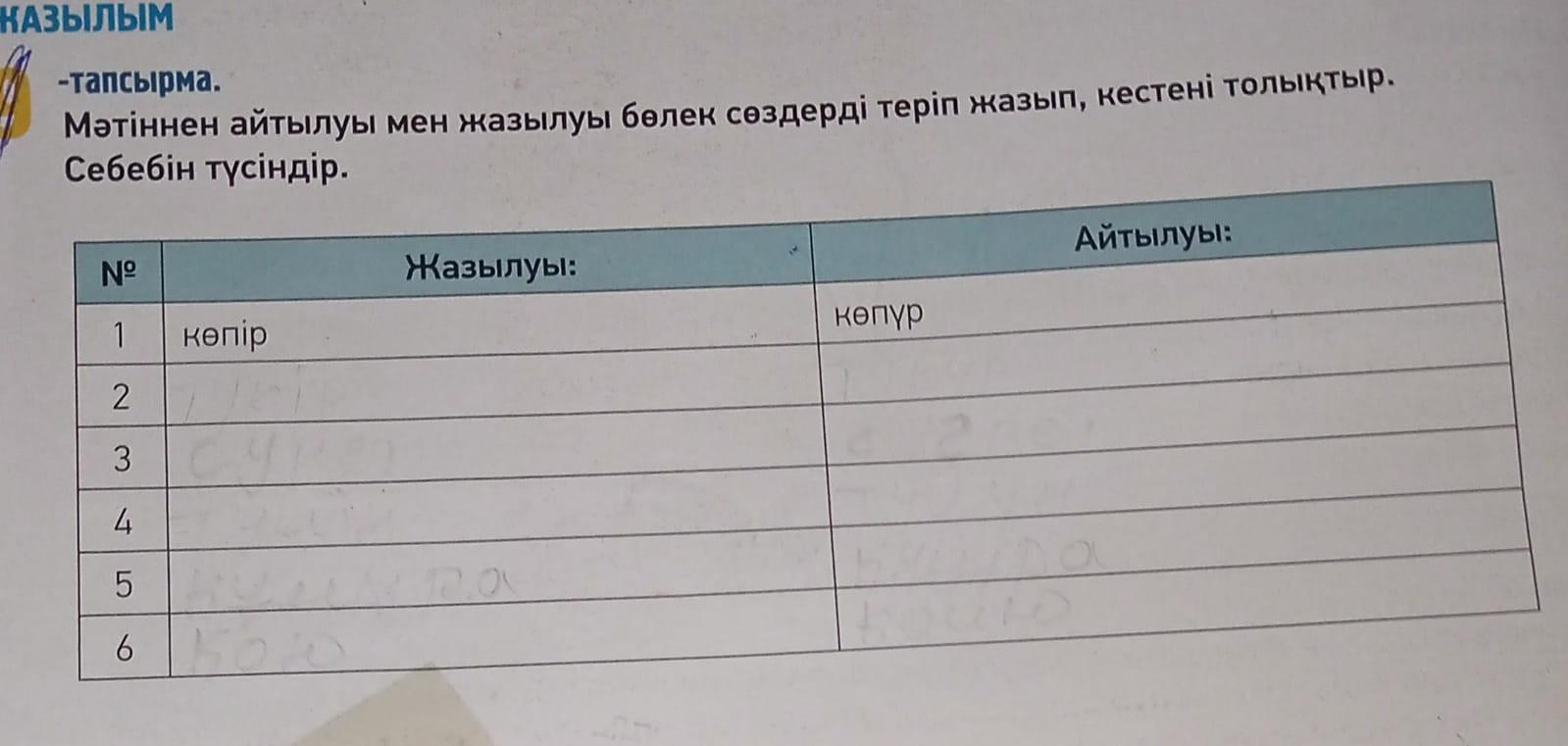 -тапсырма. Мәтіннен айтылуы мен жазылуы бөлек сөздерді теріп жазып, кестені толықтыр. Себебін түсіндір. No 1 2 3 4 5 6 көпір Жазылуы: көпүр Айтылуы: ДАЮ 55БАЛЛОВ СРОЧНО!??!?!??!?