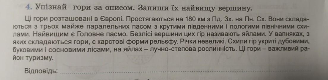 4. Упізнай гори за описом. Запиши їх найвищу вершину. Ці гори розташовані в Європі. Простягаються на 180 км з Пд. Зх. на Пн. Сх. Вони склада- ються з трьох майже паралельних пасом з крутими південними і пологими північними схи- лами. Найвищим є Головне пасмо. Безлісі вершини цих гір називають яйлами. У вапняках, з яких складаються гори, є карстові форми рельєфу. Річки невеликі. Схили гір укриті дубовими, буковими і сосновими лісами, на яйлах - лучно-степова рослинність. Ці гори - важливий район туризму.