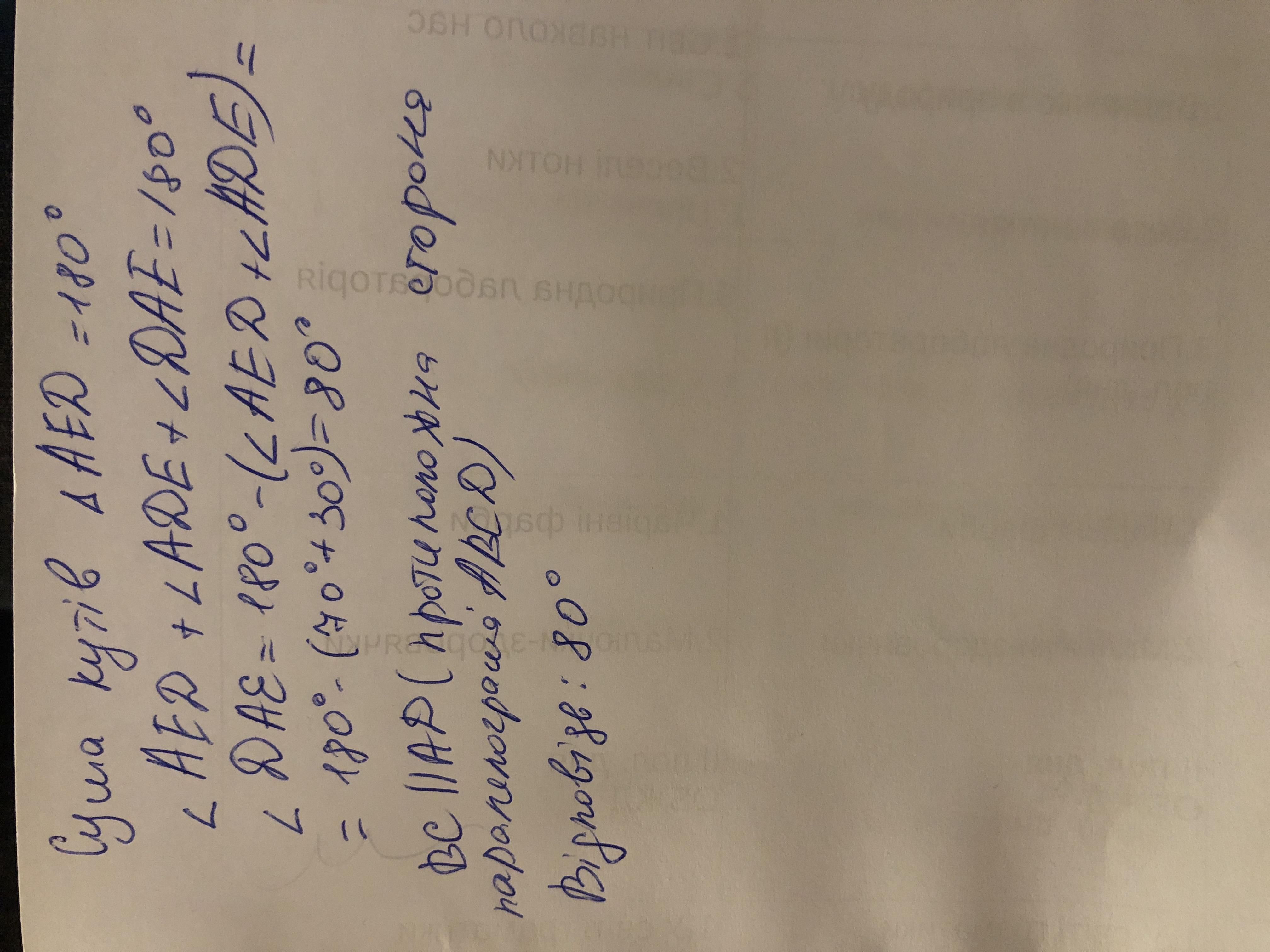 Допоможіть, будь ласка! ПОВНЕ РІШЕННЯ задачі. ТЕРМІНОВО. Паралелограм ABCD і трикутник AED не лежать в одній площині (рис. 33.8). Знайдіть кут між прямими BC і AE, якщо ∠AED = 70°, ∠ADE = 30°.