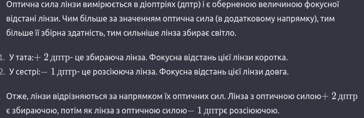 1. Оптична сила лінз у татових окулярах +2 дптр, а у сестри -1 дптр. Чим відрізняються ці лінзи?