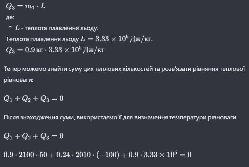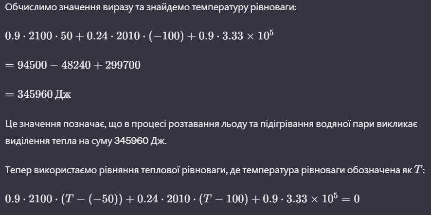 Ответ:Отже, температура рівноваги становить приблизно -146 градусів Цельсія. Це значення від'ємне, що вказує на те, що в системі відбулася зниження температури внаслідок випаровування води та розтавання льоду.