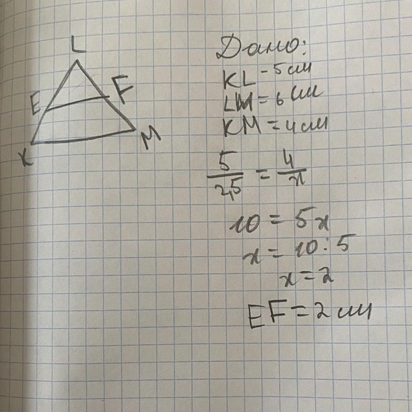 y трикутникуKLM, EF - середня лінія; KL = 5см , LM = 6см , KM = 4см. Знайдіть довжину EF