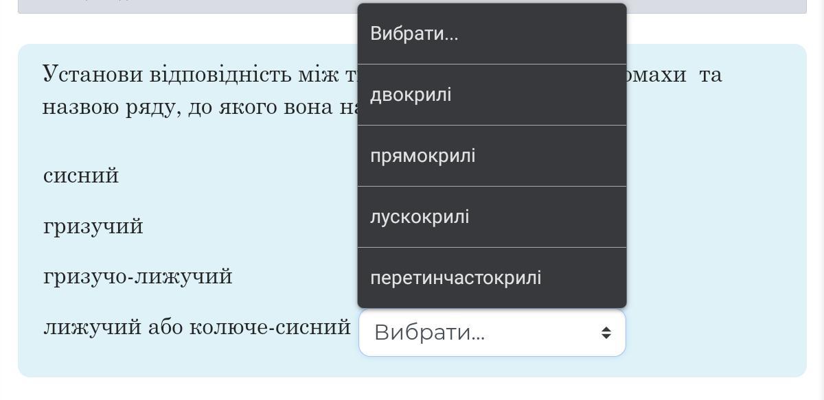 Установи відповідність між типом ротового апарата комахи та назвою ряду, до якого вона належить: