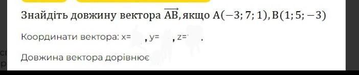 Координати вектора: х= ?, у=?, z=? Довжина вектора дорівнює ?