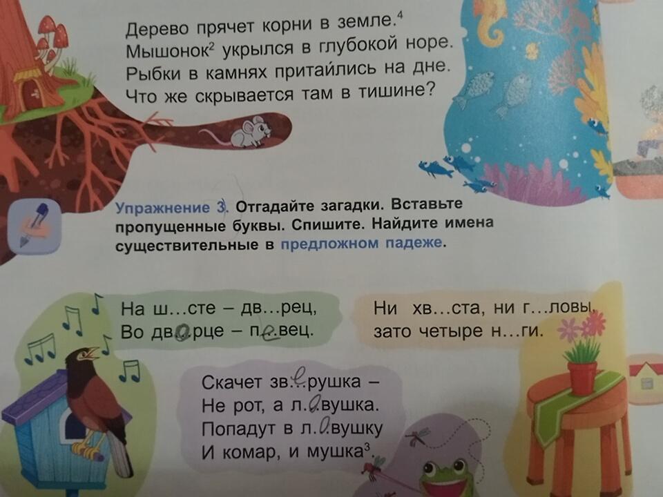 Упражнение 1. Отгадайте загадки Вставьте пропущенные буквы. Спишите. Найдите имена существительные в предложном падежа