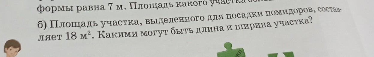 Площадь участка, выделенного для посадки помидоров, составляет 18 м². Какими могут быть длина и ширина участка?