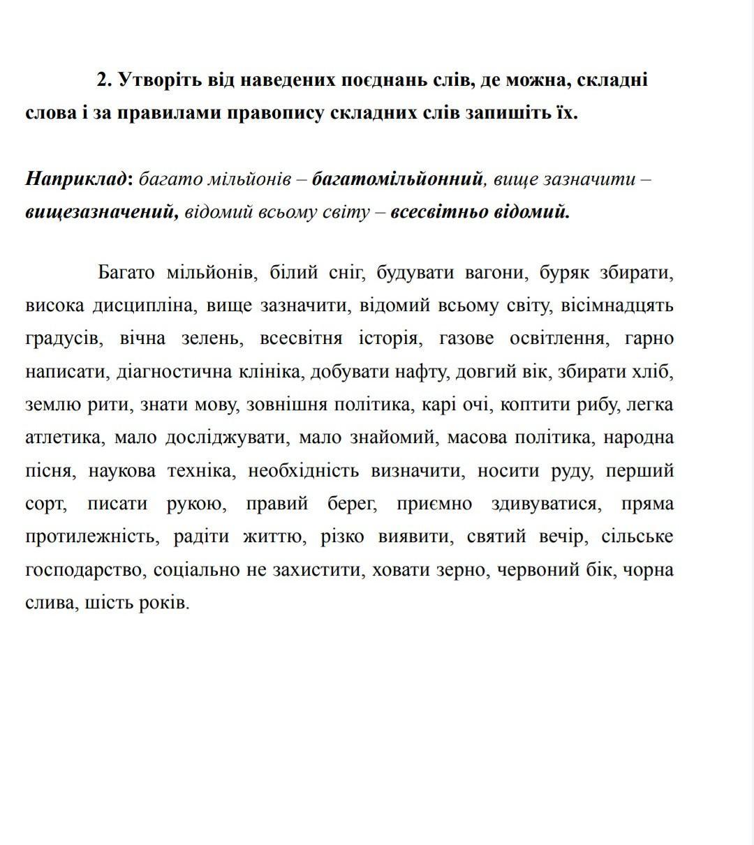 2. Утворіть від наведених поєднань слів, де можна, складні слова і за правилами правопису складних слів запишіть їх. Наприклад: багато мільйонів – багатомільйонний, вище зазначити – вищезазначений, відомий всьому світу – всесвітньо відомий. Багато мільйонів, білий сніг, будувати вагони, буряк збирати, висока дисципліна, вище зазначити, відомий всьому світу, вісімнадцять градусів, вічна зелень, всесвітня історія, газове освітлення, гарно написати, діагностична клініка, добувати нафту, довгий вік, збирати хліб, землю рити, знати мову, зовнішня політика, карі очі, коптити рибу, легка атлетика, мало досліджувати, мало знайомий, масова політика, народна пісня, наукова техніка, необхідність визначити, носити руду, перший copт, писати рукою, правий берег, приємно здивуватися, пряма протилежність, радіти життю, різко виявити, святий вечір, сільське господарство, соціально не захистити, ховати зерно, червоний бік, чорна слива, шість років. ПОМОГИТЕ ПОЖАЛУЙСТА!!!!!!