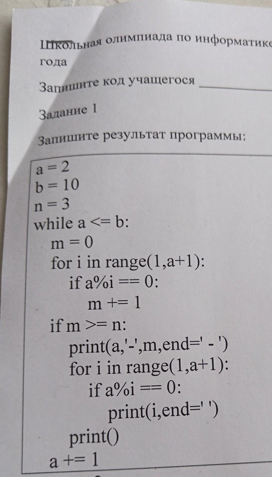 Запишите результат программы: a = 2 b = 10 n = 3 while a = n: print(a,'-',m,end=' - ') for i in range(1,a+1): if a%i == 0: print(i,end='') print() a += 1