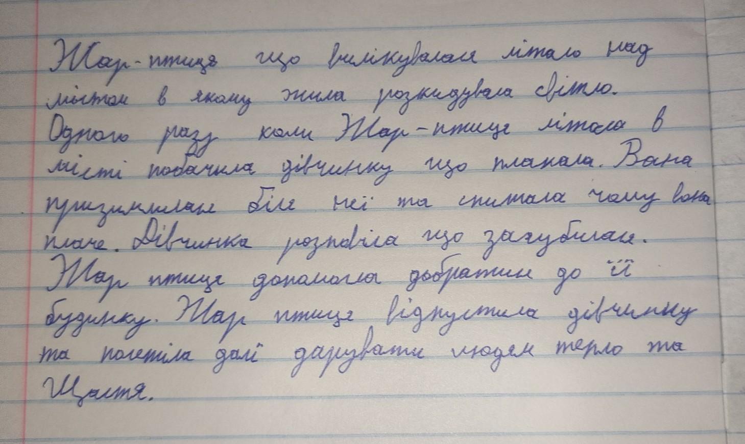 Створіть власне продовження розповіді про жар-птицю після її одужання за допомогою буд якого засобу візуалізації (твір-розповідь, малюнок, комікс, пластилін, інсценізація, буктрейлер). 2. Визначити віршований розмір поезії «Жар-птиця».