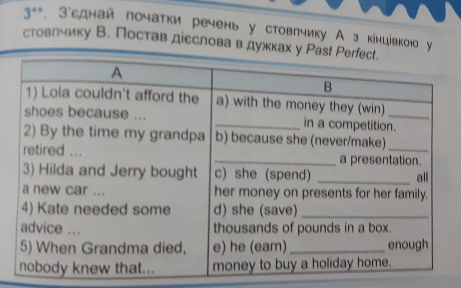 З'єднай початки речень у стовпчику А з кінцівкою у стовпчику В. Постав дієслова в дужках у Past Perfect.