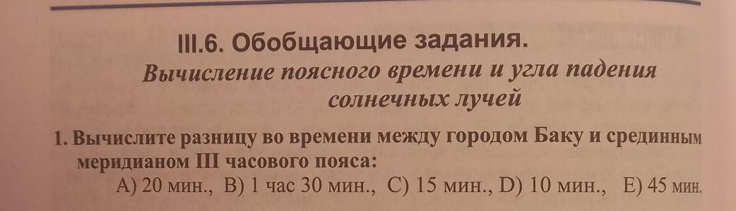 1. Вычислите разницу во времени между городом Баку и срединным меридианом III часового пояса: А) 20 мин., В) 1 час 30 мин., C) 15 мин., D) 10 мин., E) 45 мин. Венто