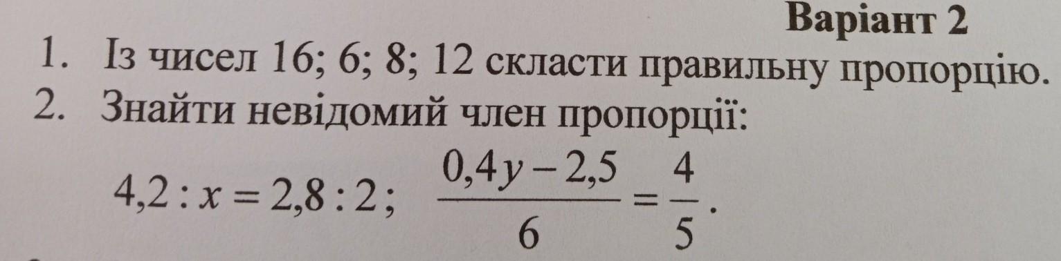1. Із чисел 16; 6; 8; 12 скласти правильну пропорцію. 2. Знайти невідомий член пропорції: 0,4y-2,5 4 = 4,2:x=2,8:2;