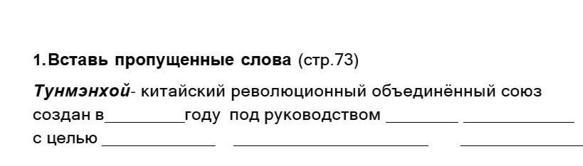 1. Вставь пропущенные слова (стр.73) Тунмэнхой- китайский революционный объединённый союз создан в году под руководством с целью