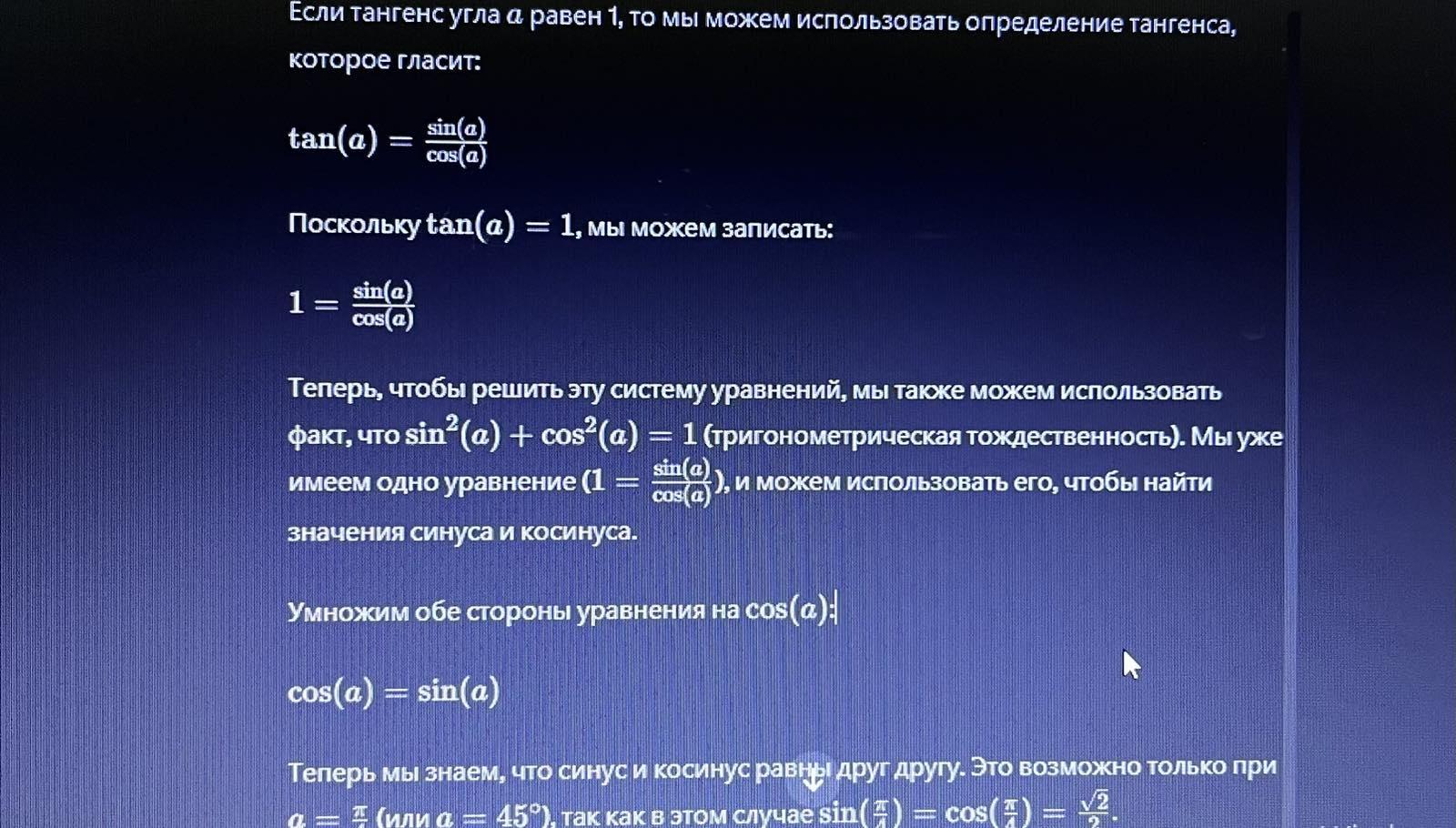 найдите синус а, косинус а, котангенс а, если тангенс а равен 1