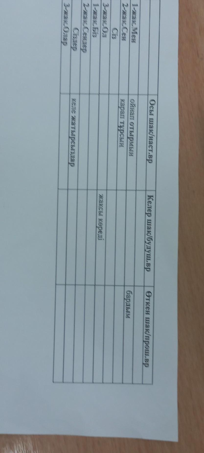 1-жак. Мен 2-жак.Сен Cit 3-жак.Ол 1-жак.Бiз 2-жаK.Ceндeр Сiздер 3-жак.Олар Осы шак/наст.вр ойнап отырмын карап тұрсын келе жатырсыздар Келер шак/будущ.вр жаксы кореді Өткен шак/прош.вр бардым