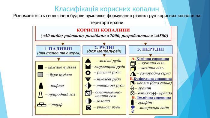 Класифікація корисних копалин Різноманітність геологічної будови зумовлює формування різних груп корисних копалин на території країни