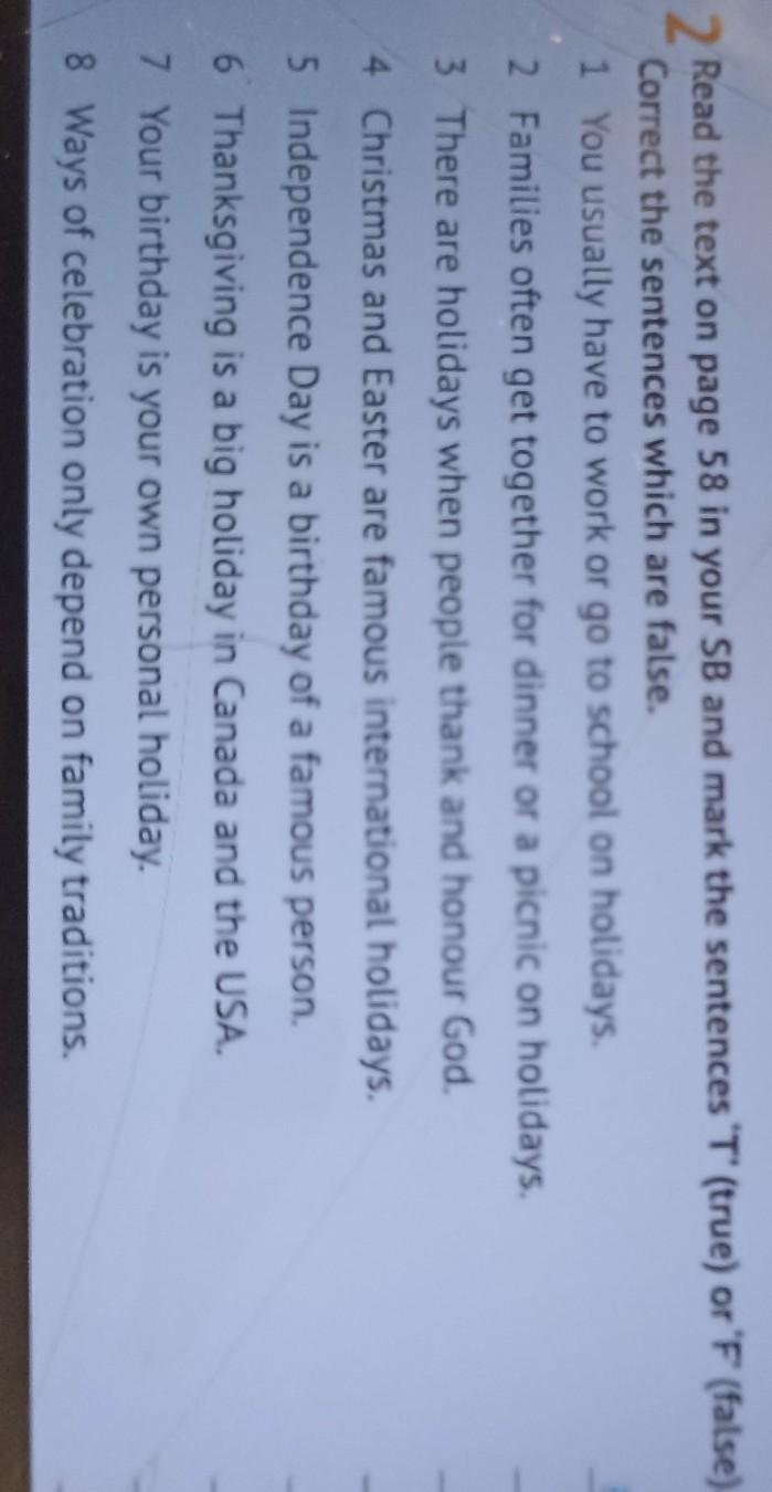 2 Read the text on page 58 in your SB and mark the sentences 'T' (true) or 'F' (false). Correct the sentences which are false. 1 You usually have to work or go to school on holidays. 2 Families often get together for dinner or a picnic on holidays. 3 There are holidays when people thank and honour God. 4 Christmas and Easter are famous international holidays. 5 Independence Day is a birthday of a famous person. 6 Thanksgiving is a big holiday in Canada and the USA. 7 Your birthday is your own personal holiday. 8 Ways of celebration only depend on family traditions. F