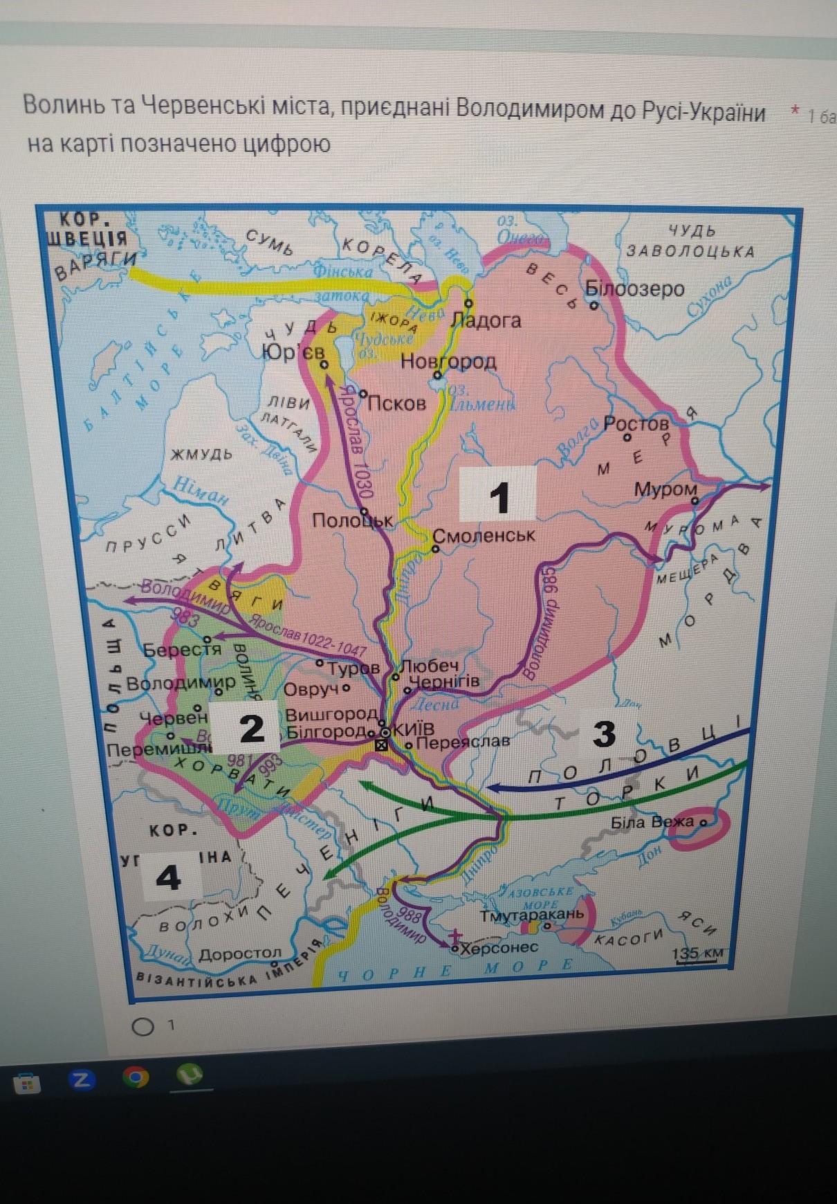 Волинь та Червенські міста, приєднані Володимиром до Русі-України на карті позначено цифрою * 1 бал