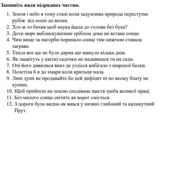 Ответ:1. часу; 2. питальне; 3. часу; 4. ступеневе; 5. причини; 6. способу; 7. місця; 8. умови; 9. мети; 10. мети; 11. порівняння; 12. опису.