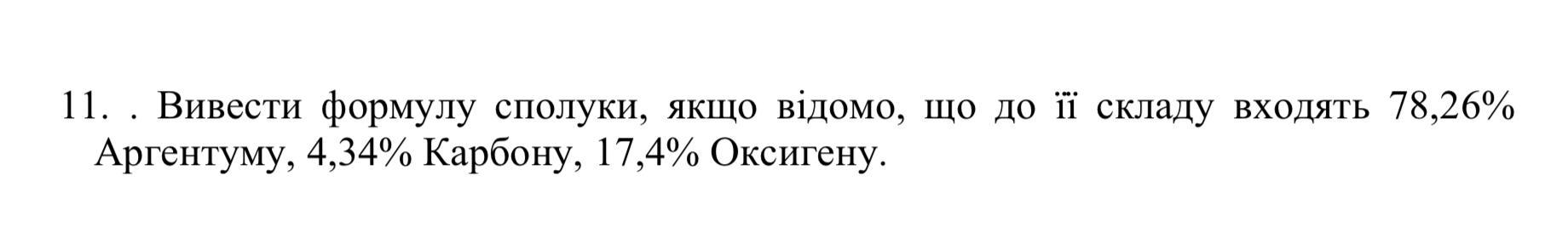 Вивести формулу сполуки, якщо відомо, що до її складу входять 78,26% Аргентуму, 4,34% Карбону, 17,4% Оксигену. Пожалуйста срочно надо!! ДАМ 34 БАЛЛА