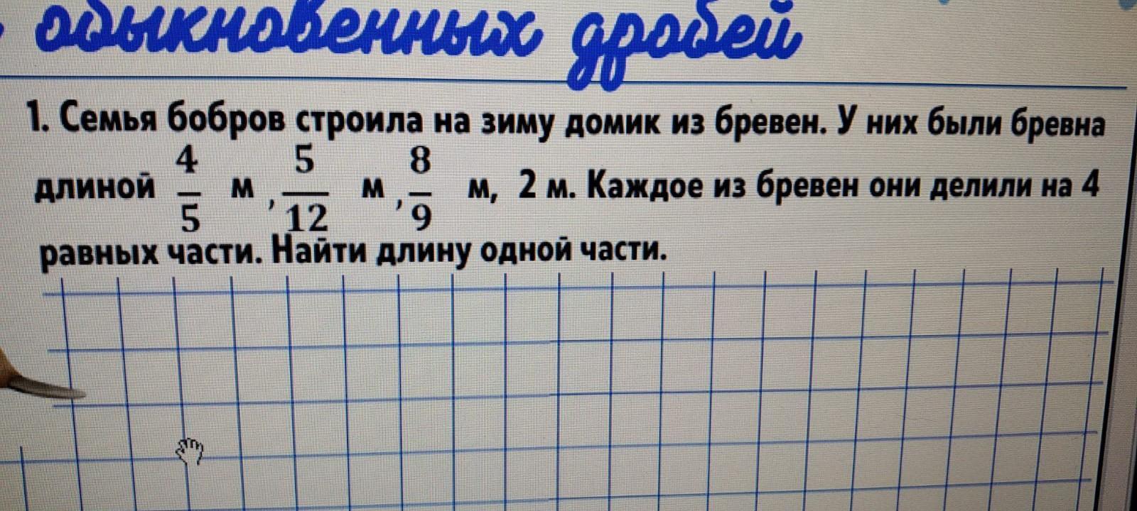 обыкновенных дробей 1. Семья бобров строила на зиму домик из бревен. У них были бревна 4 8 м, 2 м. Каждое из бревен они делили на 4 5 длиной M - — - 5 '12 9 равных части. Найти длину одной части. @math.pros M. ДАЮ ВСЕ