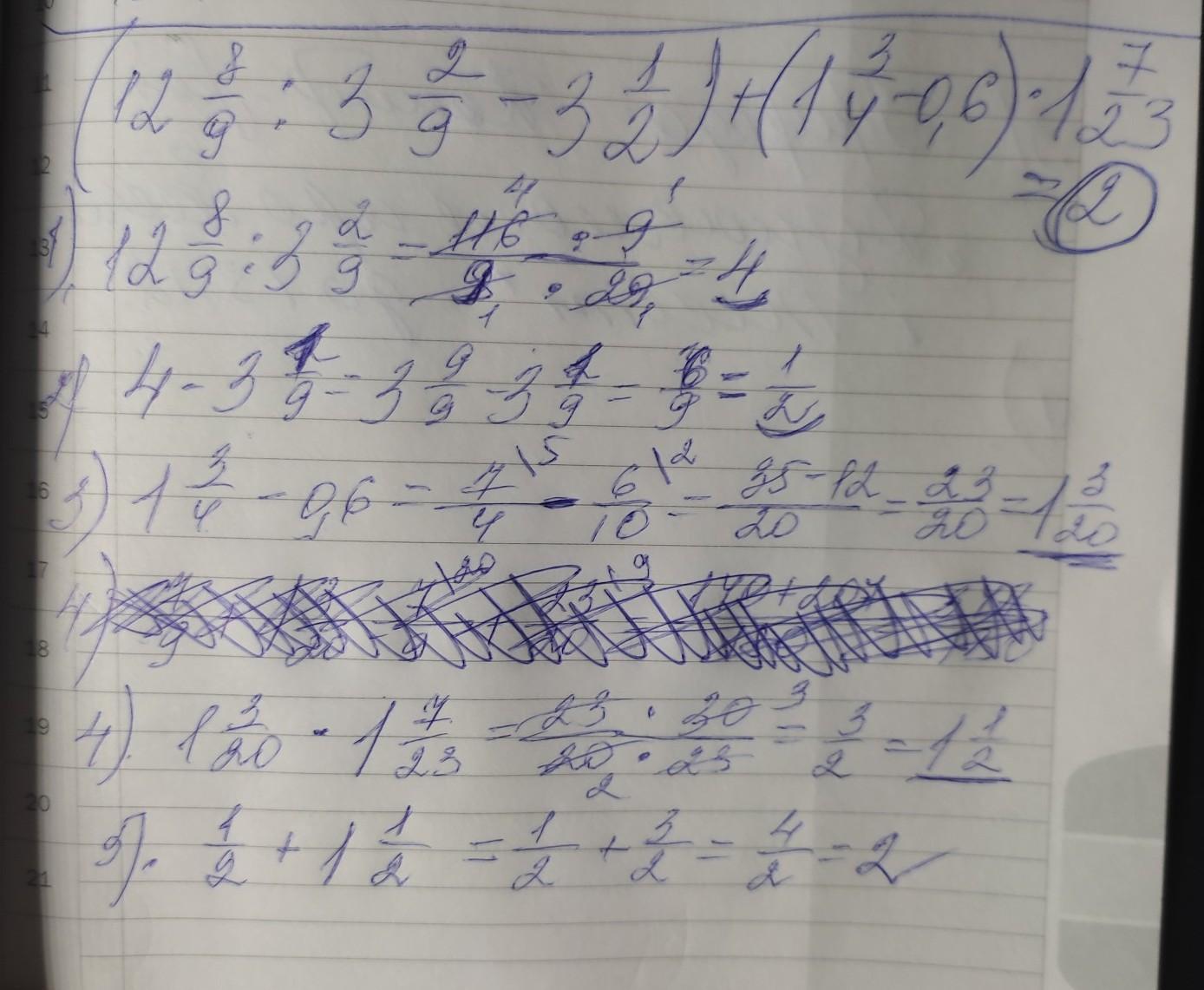 знайди значення виразу (12 цілих 8/9 : 3 цілих 2/9-3 цілих 1/2)+ (1 цілих 3/4 - 0,6) * 1 цілу 7/23