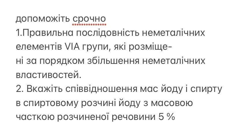 1.Правильна послідовність неметалічних елементів VIA групи, які розміщені за порядком збільшення неметалічних властивостей, це кисень (O), сірка (S), селен (Se), телур (Te) та полоній (Po).