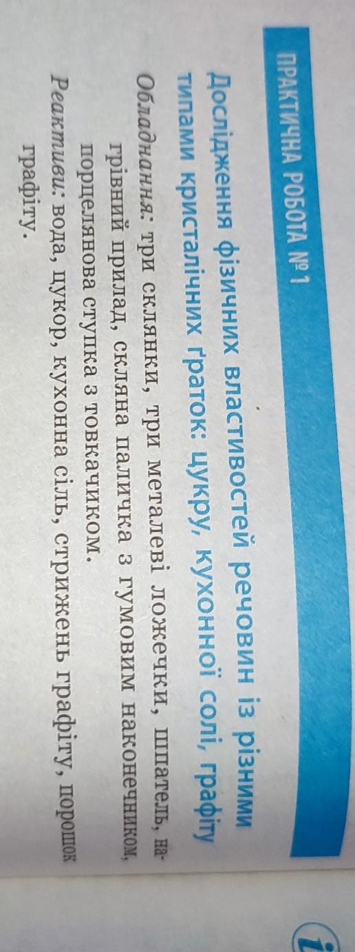 Помогите Практична робота номер 1 дослідження фізичних властивостей речовин із різними типами коисталічних ґраток :цукор, кухонна сіль,графіту срочноооооооооооо пжпж даю 50 балов