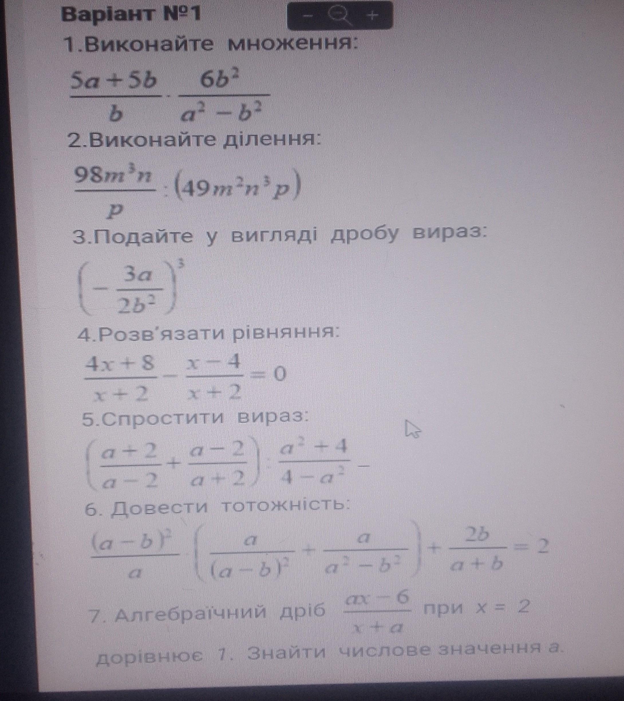 Варiант №1 1.Виконайте множення: Sa+5b 662 a - b Ь 2.Виконайте ділення: 9$m'n (49mn`p) Р 3.Подайте у вигляді дробу вираз: За 26² 4. Розв'язати рiвняння: 4x + 8 - 0 x+2 x-4 x+2 5.Спростити вираз: Q+ a+2 a-2 a-2 a+2 + a2 + 4 6. Довести тотожність: (a-b) а (a-b) a - b 2b a+b 7. Алгебраїчний дріб ax - 6 x+a при х = 2 дорівнює 1. Знайти числове значення а