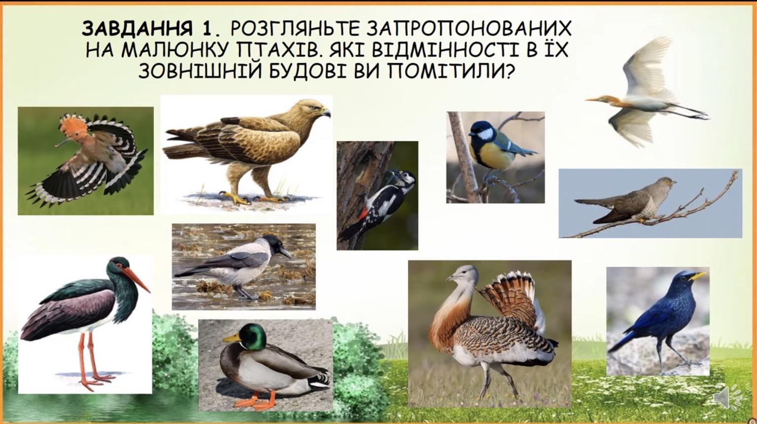 скоріш за все так: Птахи мають різне забарвлення.Одні переважно мешкають на водоймах другі на суходолі або в повітрі.Їхня зовнішня будова:голова,наддзьобок,піддзьобок,восковиця,шия тулуб,крила,задні кінцівки,хвіст.В них є перо воно складається з стрижня, борідки першого порядку і другого,опахало,колодочка