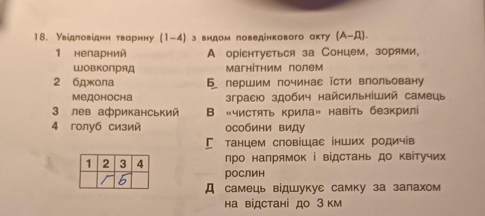 18. Увiдповiдни тварину (1-4) з видом поведінкового акту (А-Д). 1 непарний шовкопряд 2 бджола медоносна 3 лев африканський голуб сизий 4 1234 Пб А орієнтується за Сонцем, зорями, магнітним полем Б першим починає їсти впольовану зграєю здобич найсильніший самець в «чистять крила» навіть безкрилі особини виду Г танцем сповіщає інших родичів про напрямок і відстань до квітучих рослин Д самець відшукує самку за запахом на відстані до 3 км