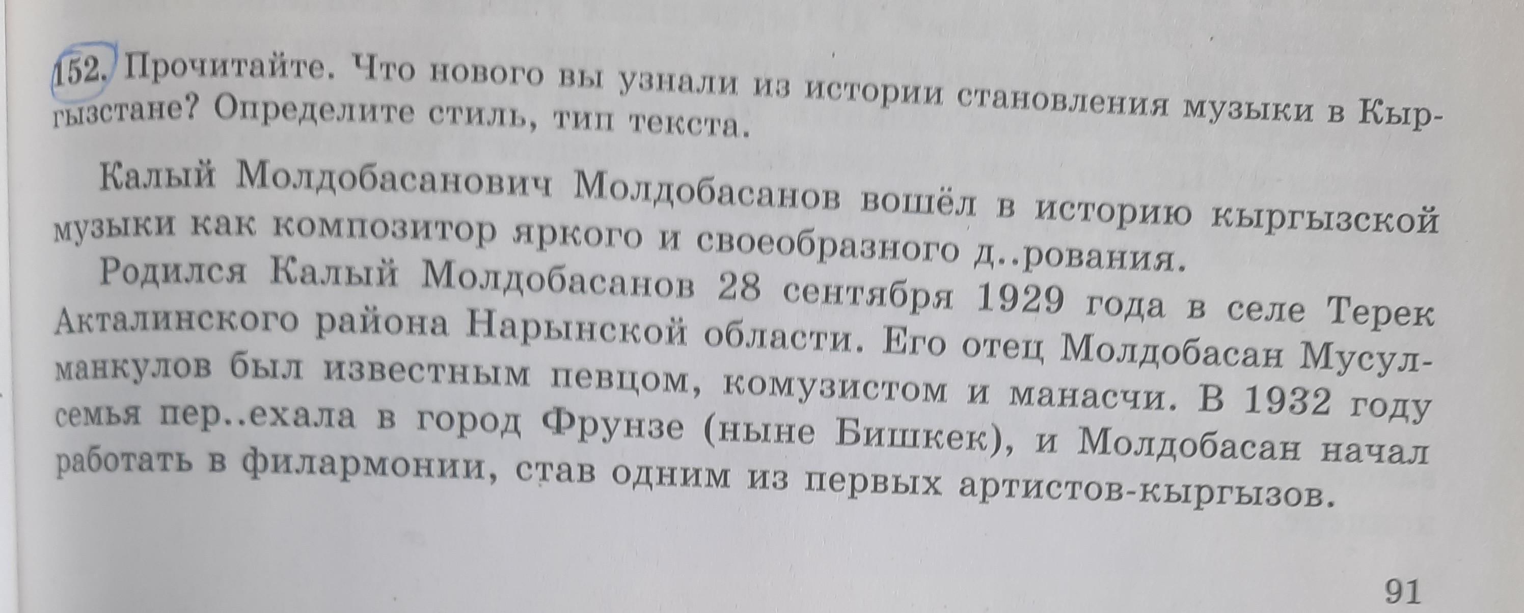 152. Прочитайте. Что нового вы узнали из истории становления музыки в Кыр- гызстане? Определите стиль, тип текста.