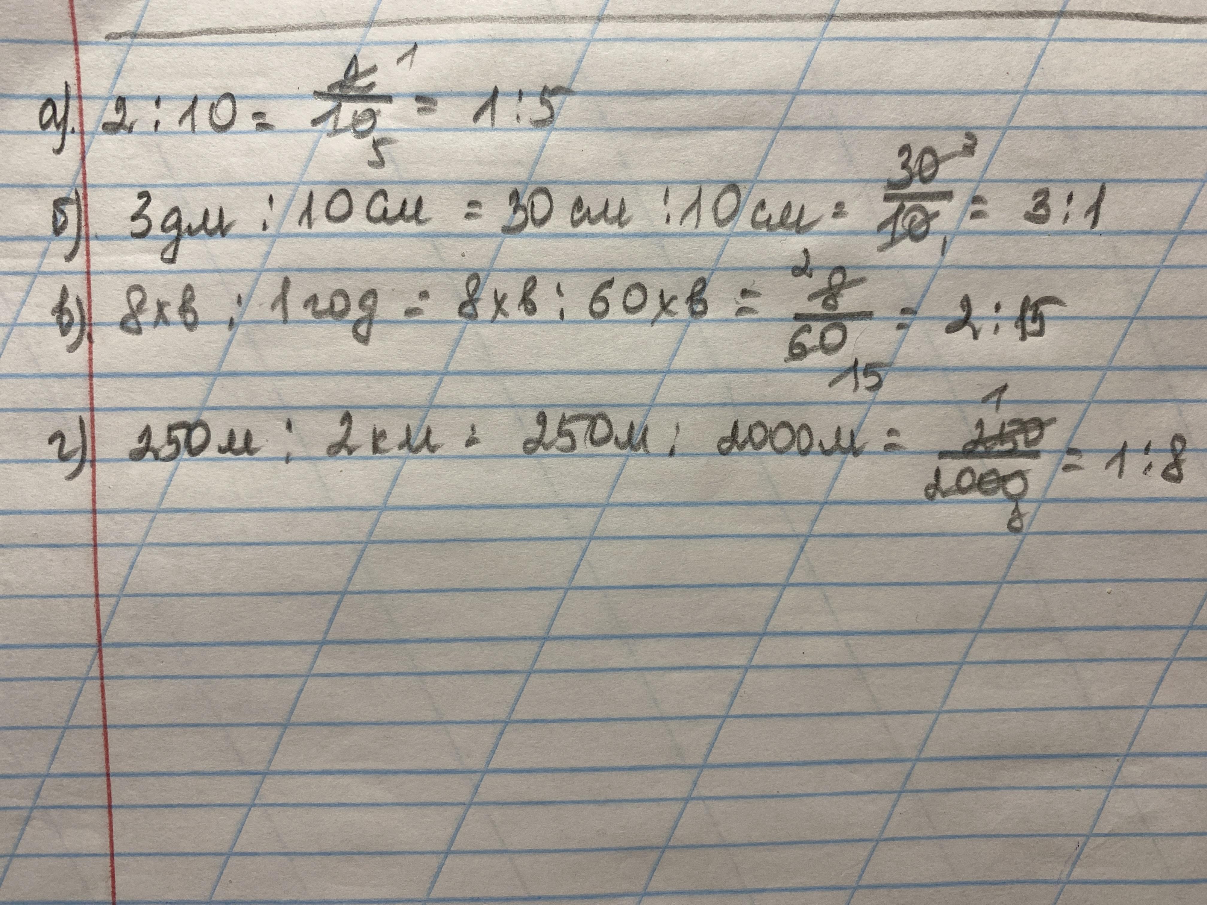 а) 2 до 10; б) 3 дм до 10 см; в) 8 хв до 1 год; г) 250 м до 2 км.