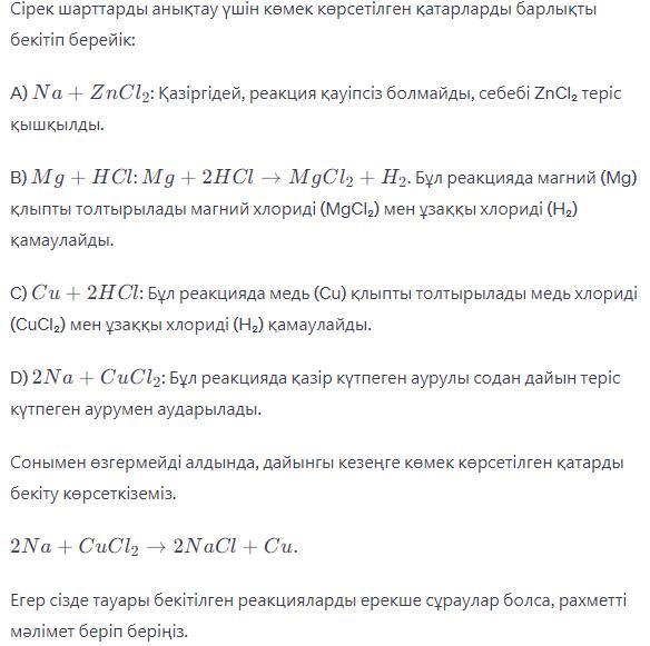 1. Зертханада сутекті алуға болатын реакция A) Na + ZnCl2 - B) Mg + HCI C) Cu + HCI - D) Na + CuCl2-