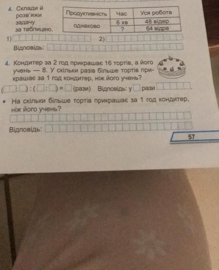 3) 8 - 4 = 4 (торта) - больше украшает за 1час кондитер чем ученик