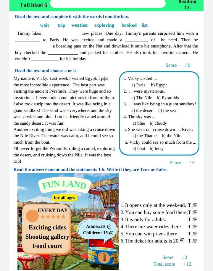 Read the text and complete it with the words from the box. Timmy likes **exploring** new places. One day, Timmy's parents surprised him with a **trip** to Paris. He was excited and made a **list** of what he needed. Then he **booked** a boarding pass on the Net and downloaded it onto his smartphone. After that, the boy checked the **weather** and packed his clothes. He also took his favorite camera. He couldn't **wait** for his holiday.