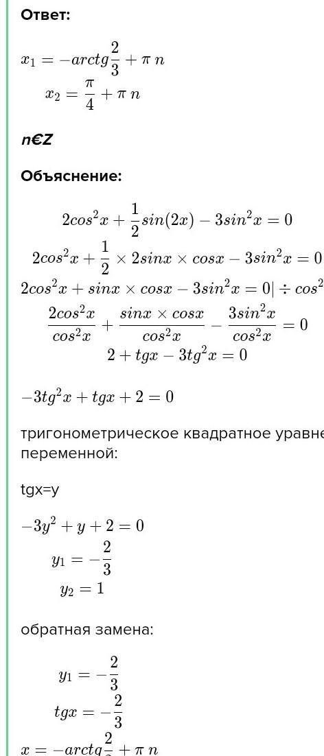 очень срочно!!!!помогите пожалуйста решить уравнение 2cos²x+1/2sin2x-3sin²x=0